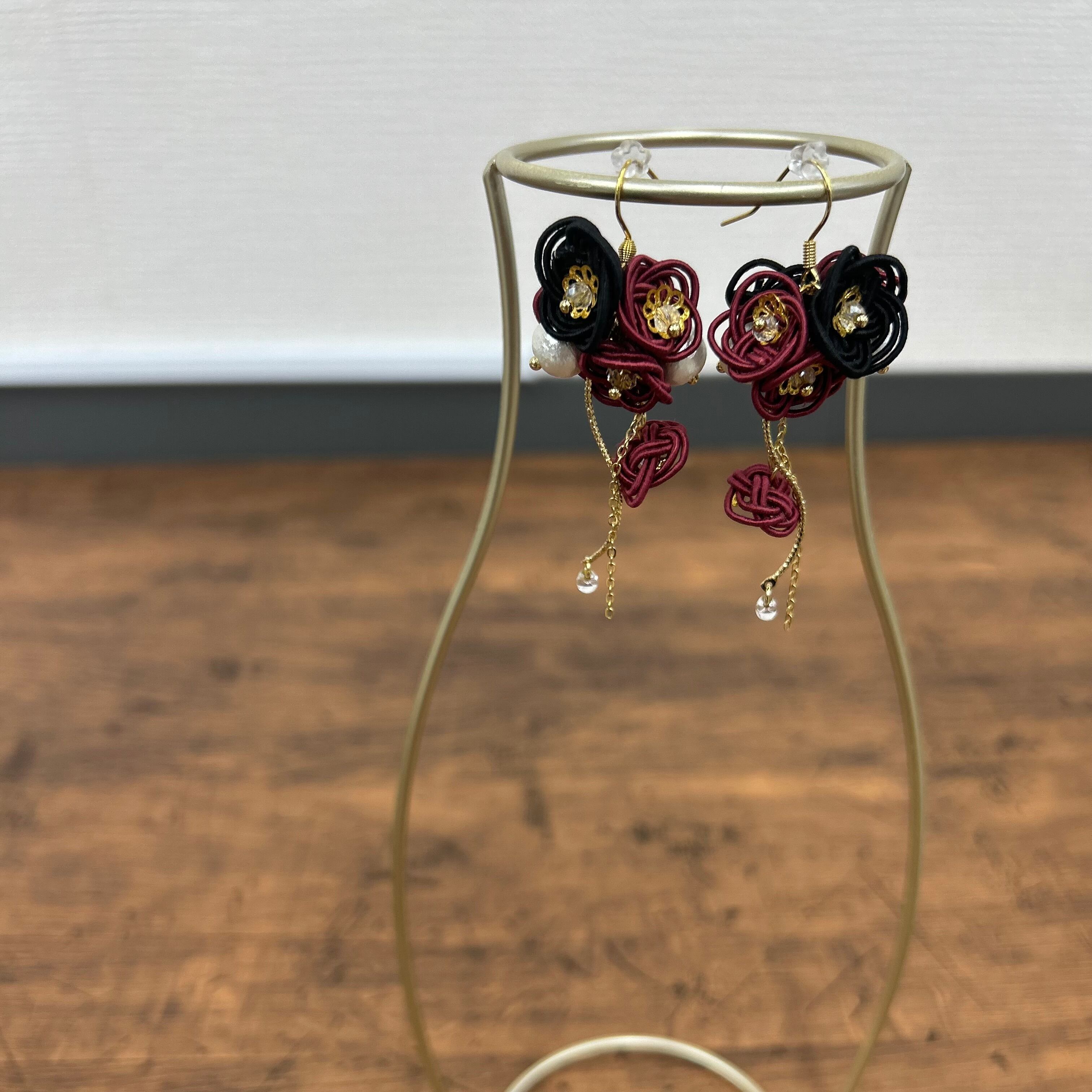 黒とボルドーの花が、シックでお洒落な印象のピアスです。