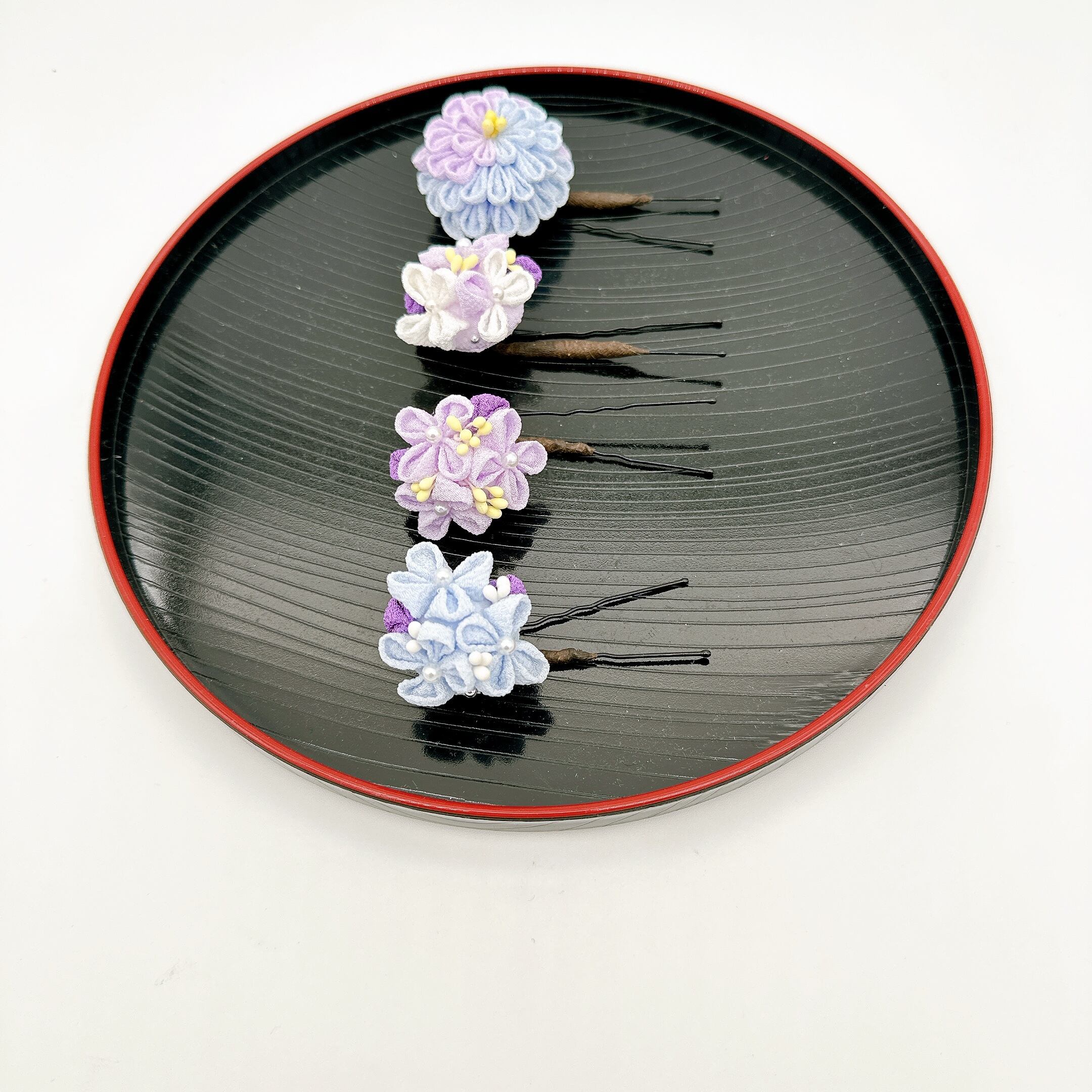 【つまみ細工のかんざしセット】 あじさい風 「4本セット」紫系2本