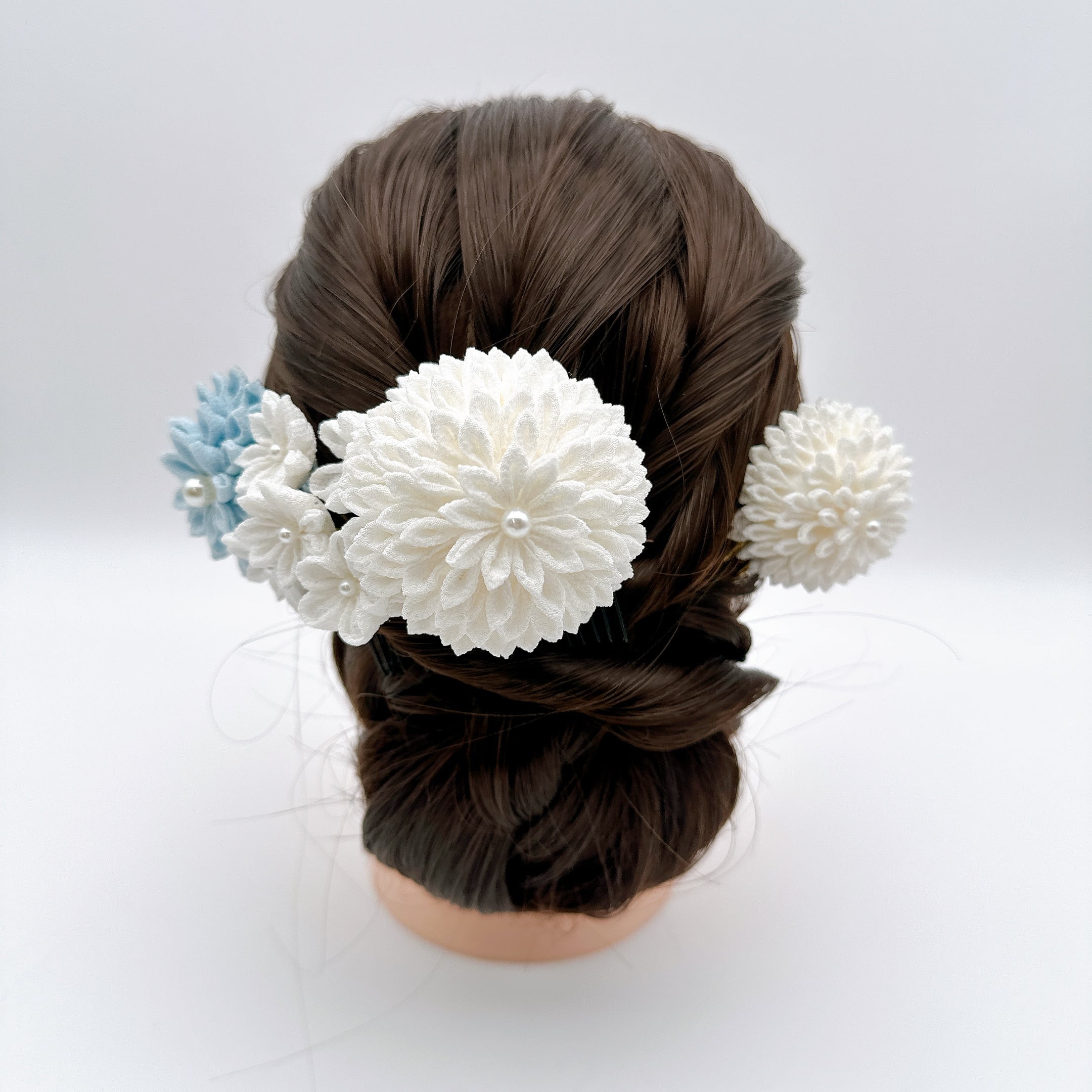 品番 T1-11 かんざしセット 白ダリアかんざしと水色ダリアかんざし