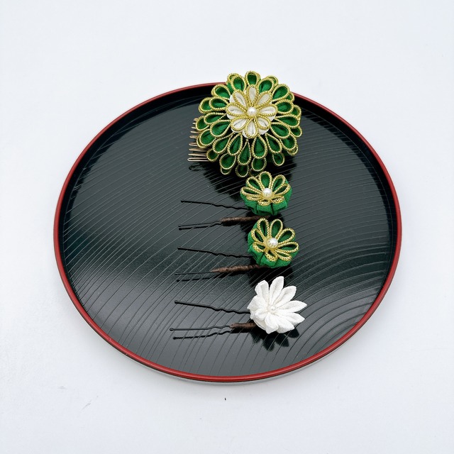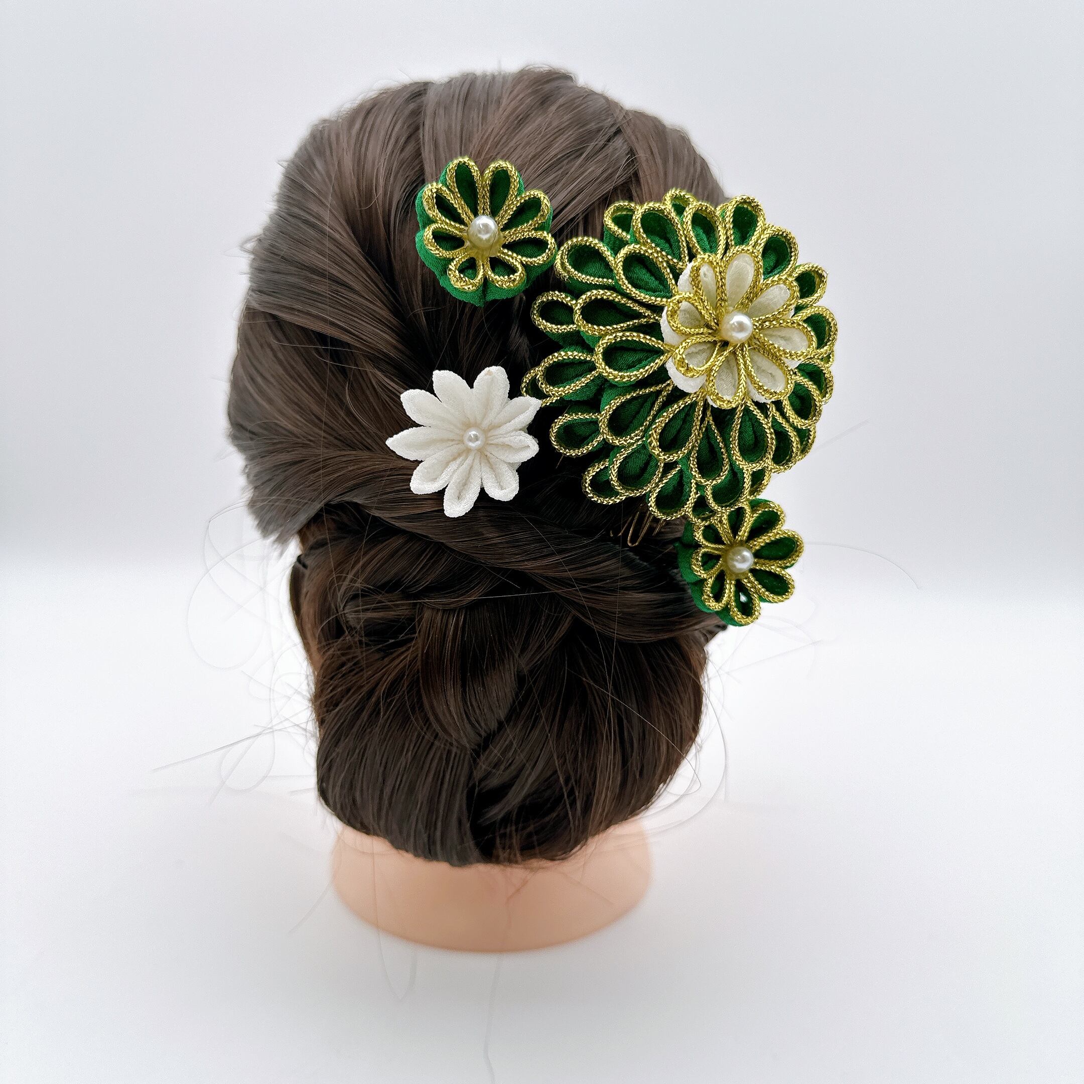 【つまみ細工のかんざしセット】かんざしセット 緑×白×金縁セット