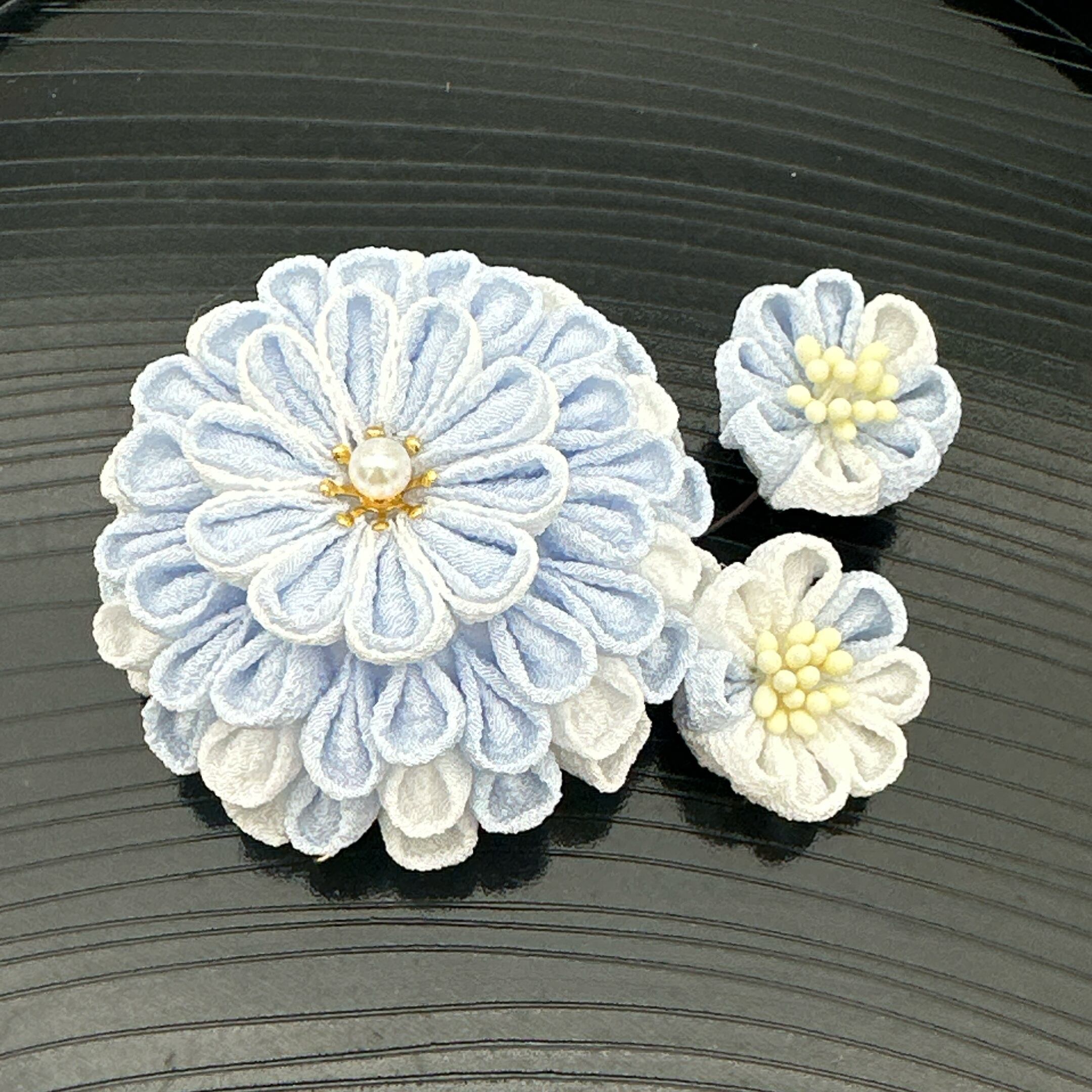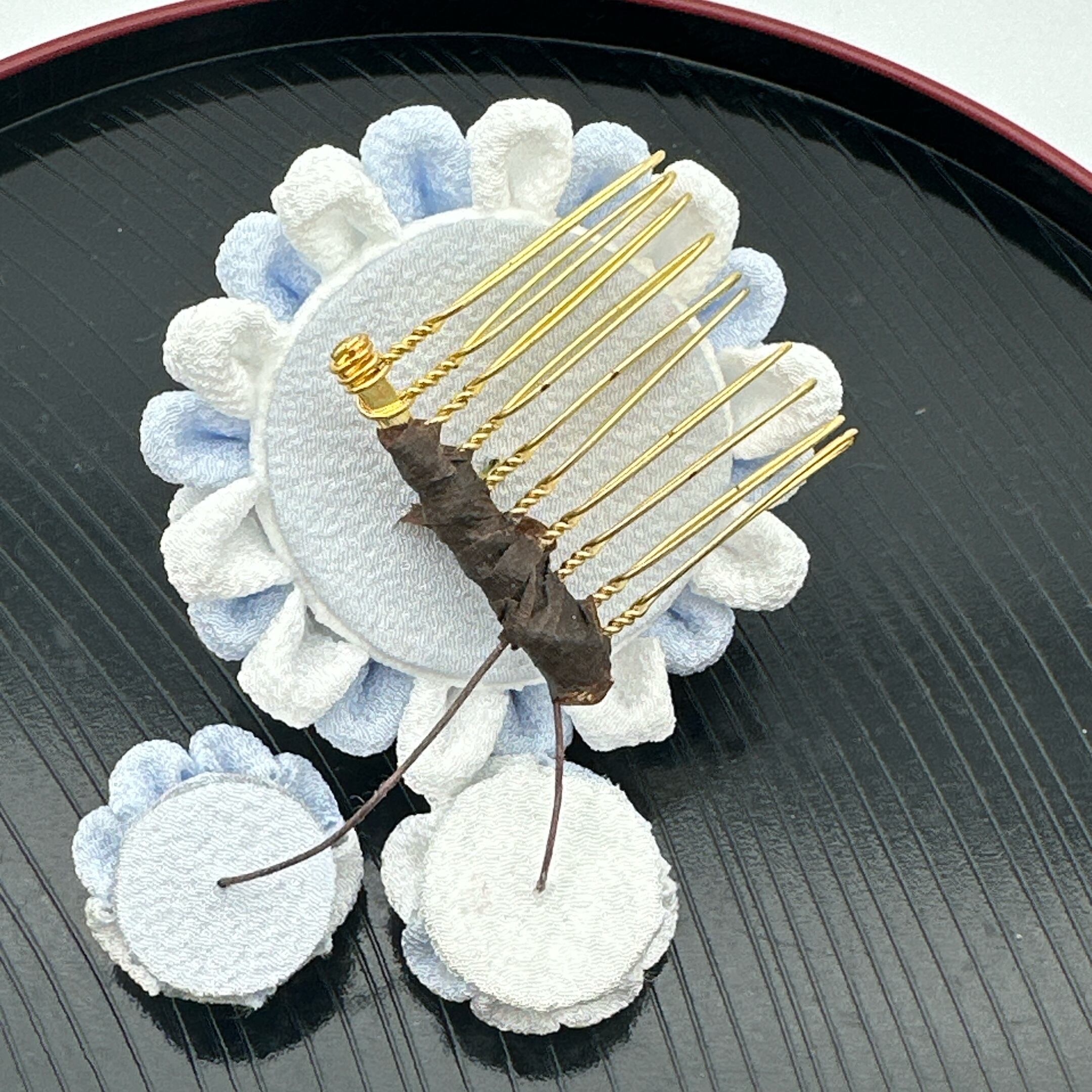【つまみ細工のコーム】 水色丸花コーム(大花1、小花2)
