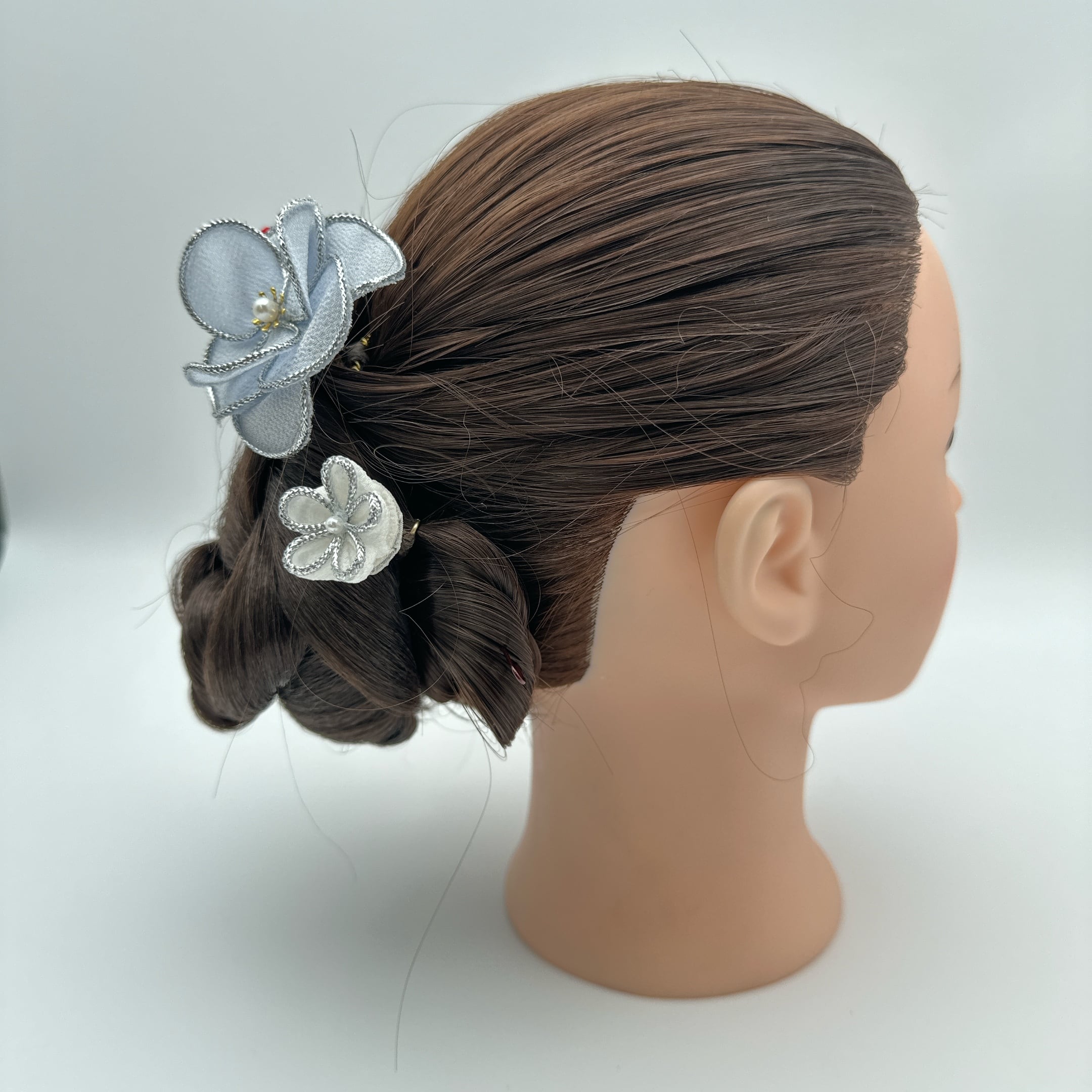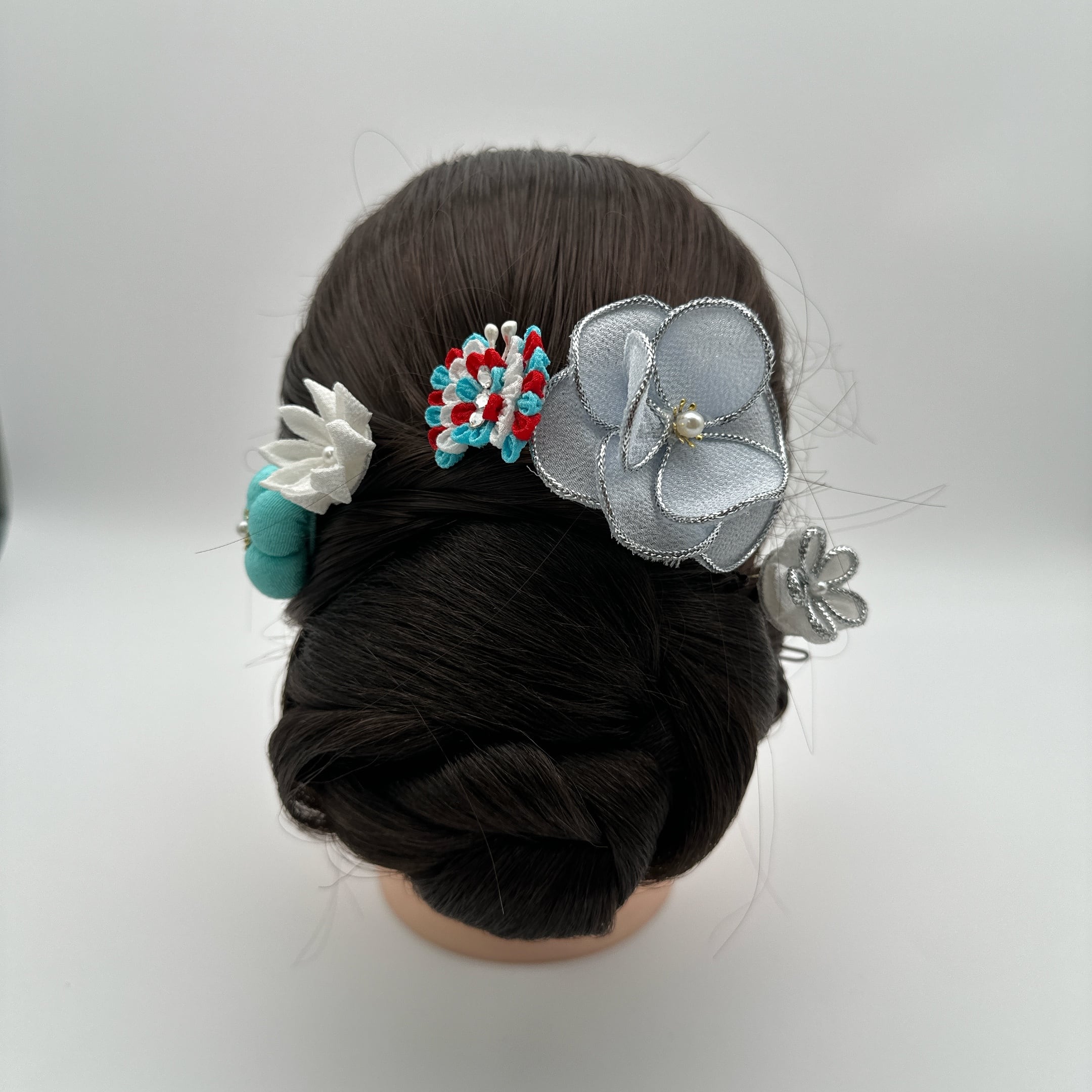 【つまみ細工のかんざしセット】かんざしセット 薄青花・蝶・水色梅・銀ふち小花・白小花
