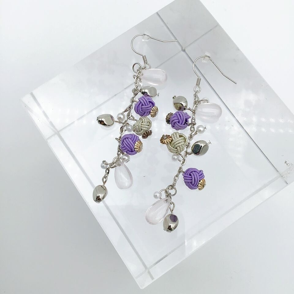 ビーズや玉結びがたくさんついた、可愛らしい揺れ感ピアスです。