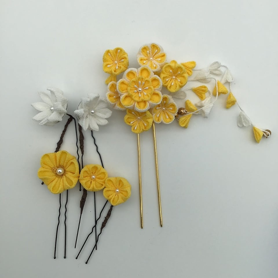 こちらは、日本の伝統的な技法であるつまみ細工の髪飾りセットです。