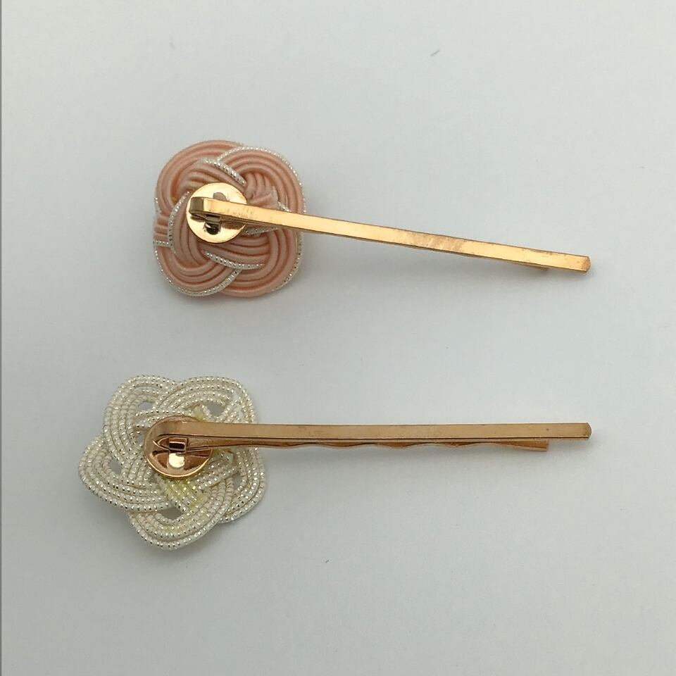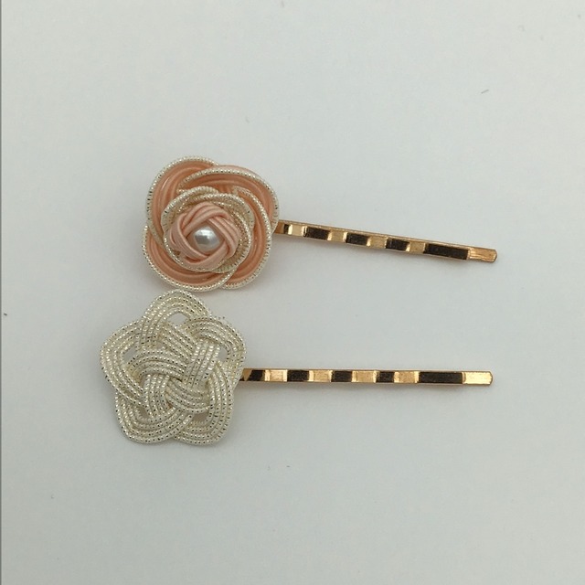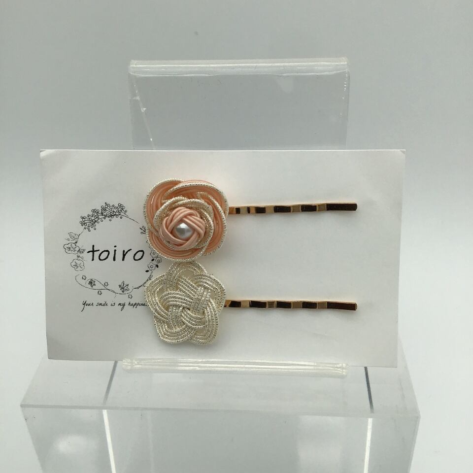【水引ヘアピン】キラリ×お花 アメピンセット ピンク×ホワイトゴールド