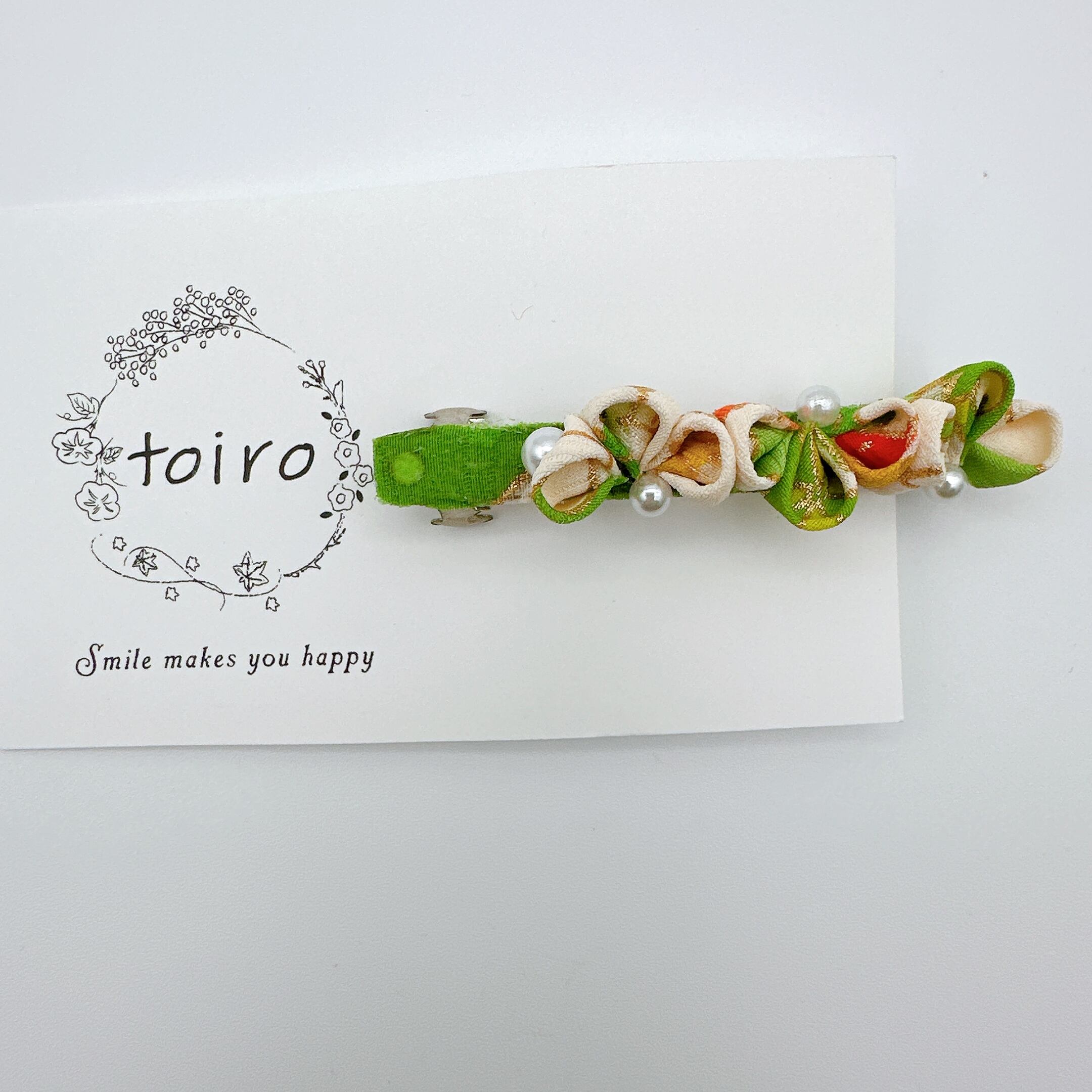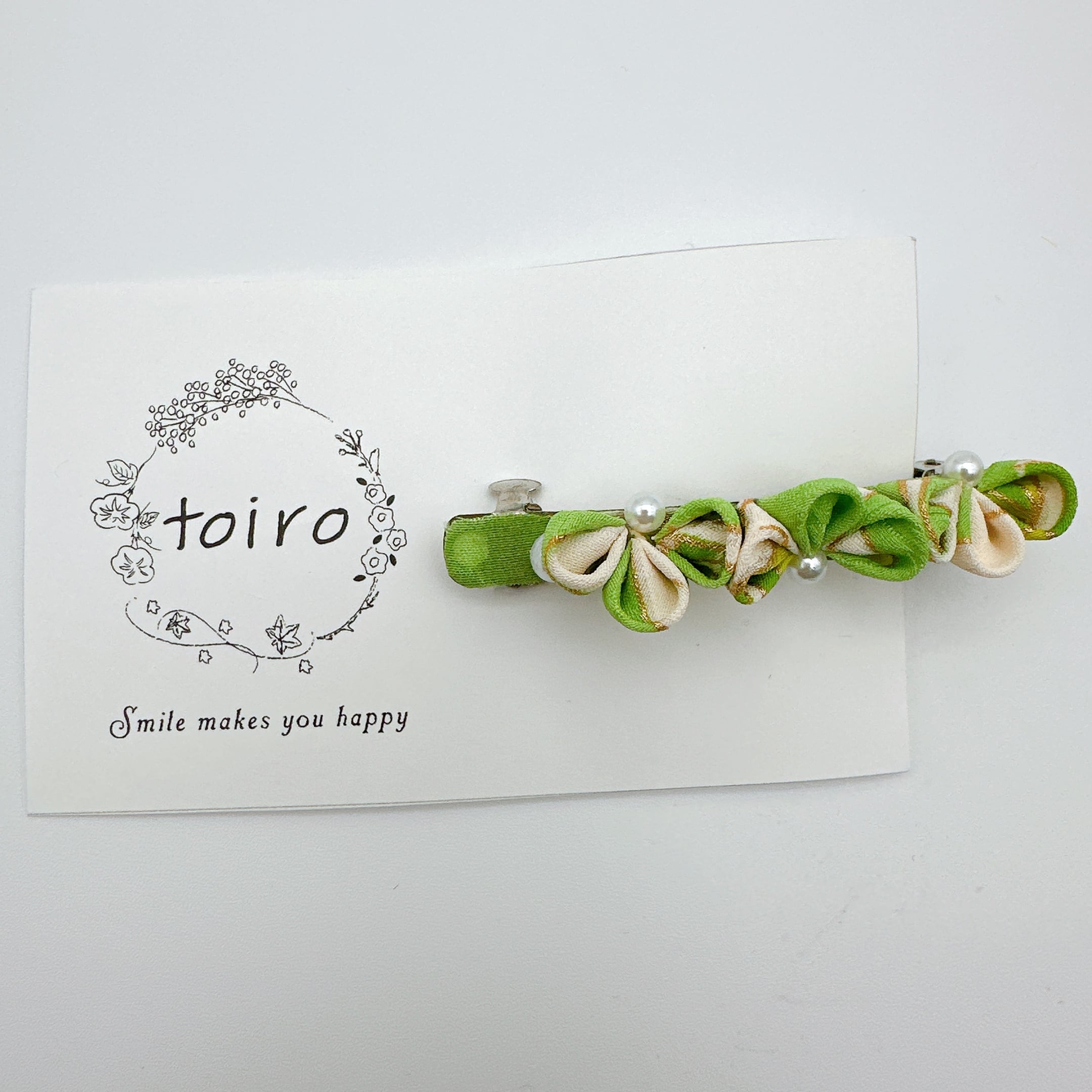 こちらは、爽やかな若草色とやさしい生成り色のつまみ細工を並べた、