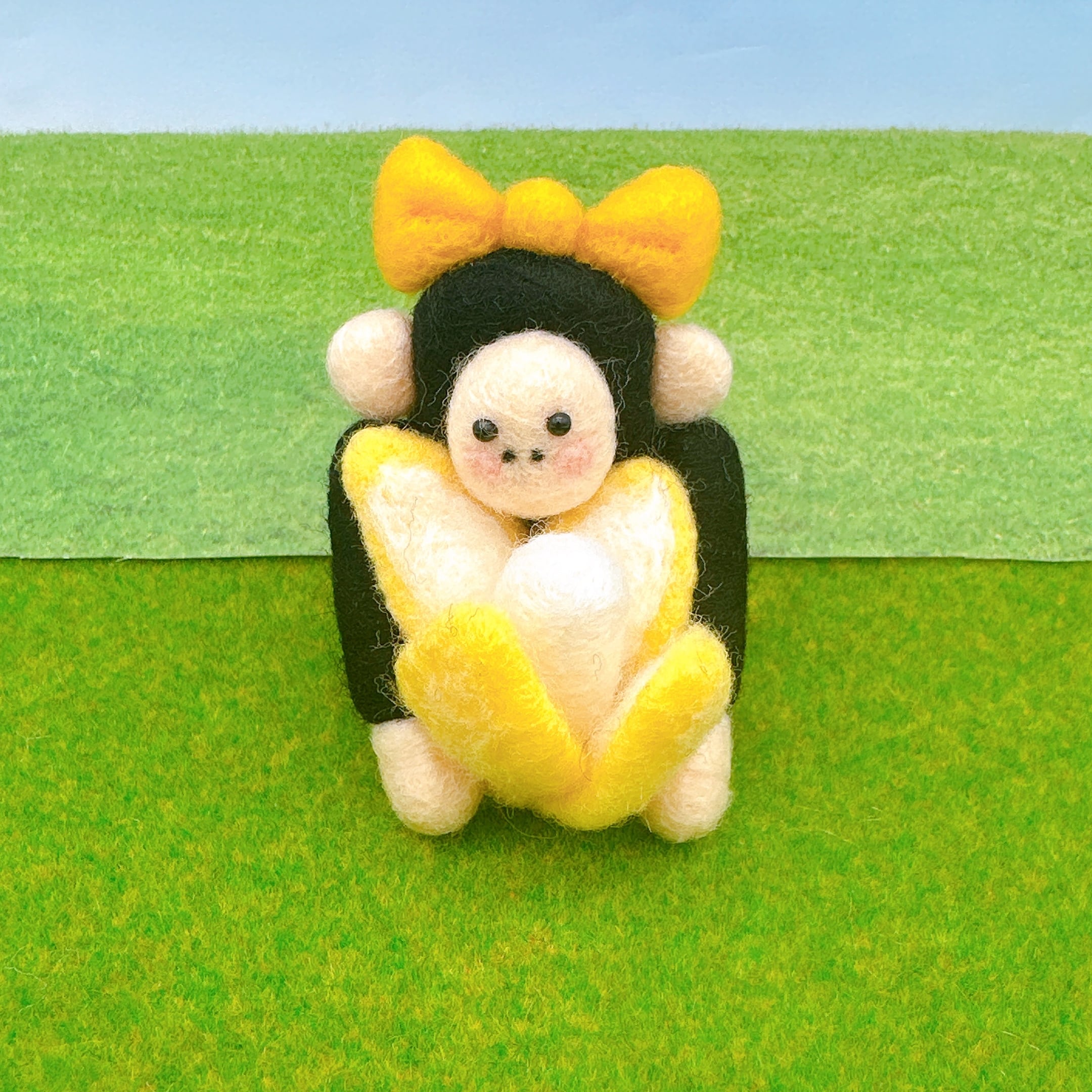バナナの色に合わせて黄色いリボンをつけたゴリ子です。