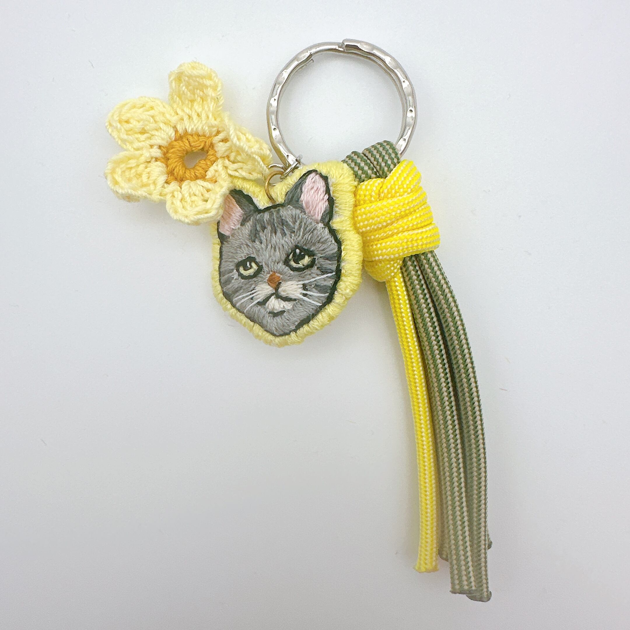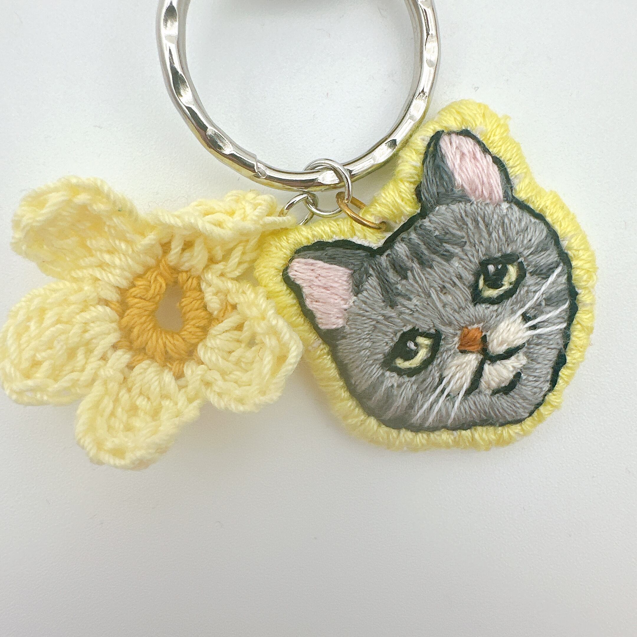 猫刺繍と花モチーフのキーホルダーです。