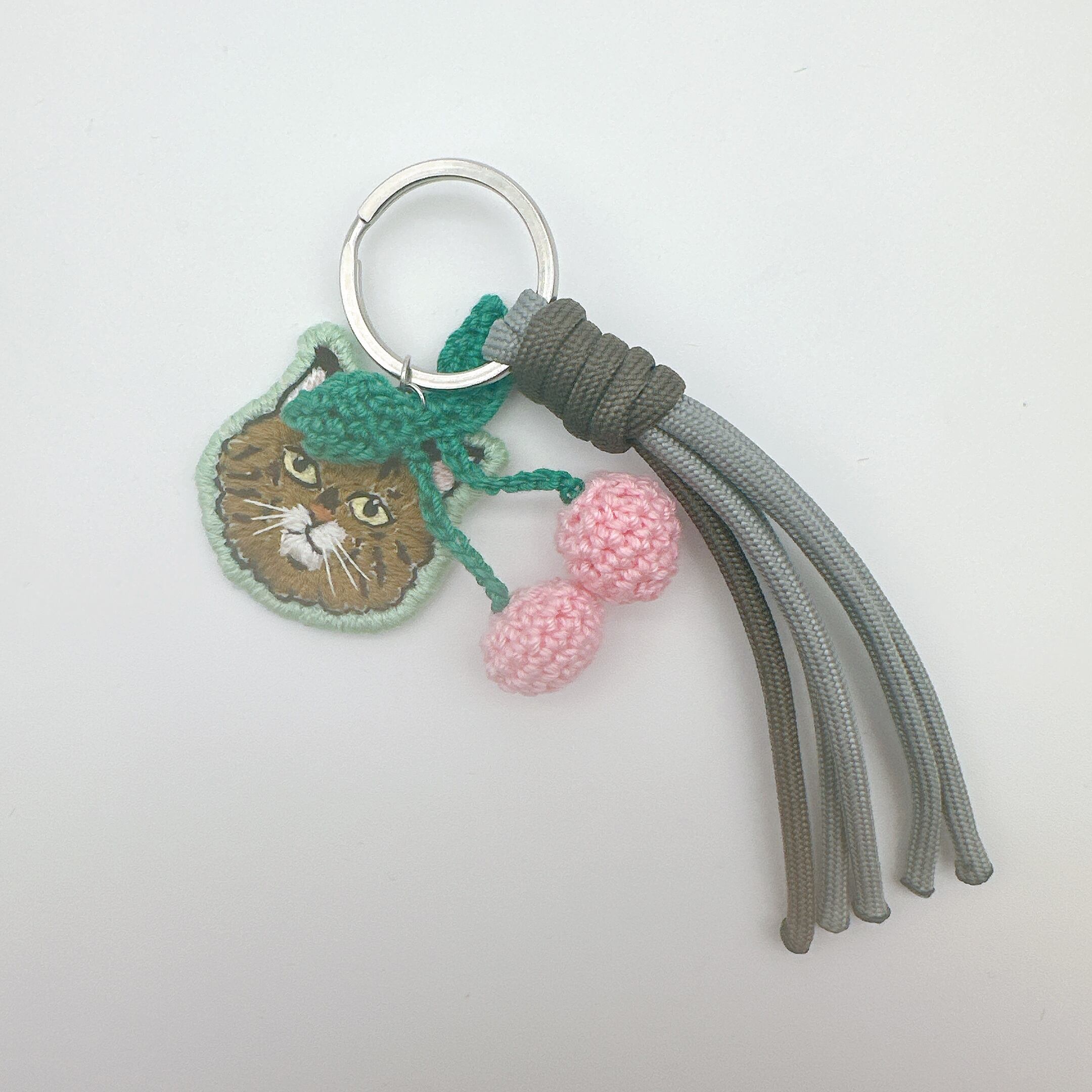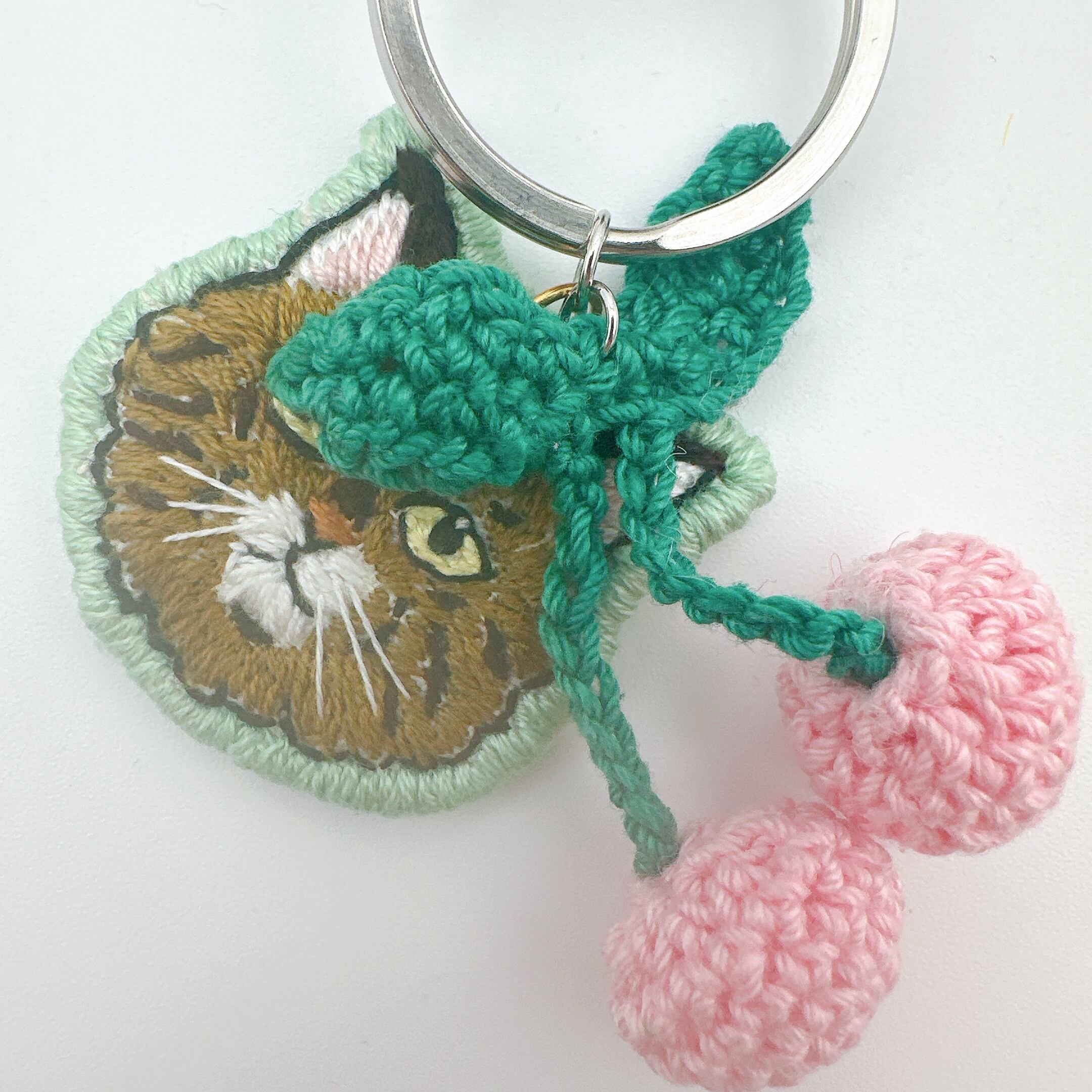 S2-36 刺繍キーホルダー 茶猫 ピンクさくらんぼ②
